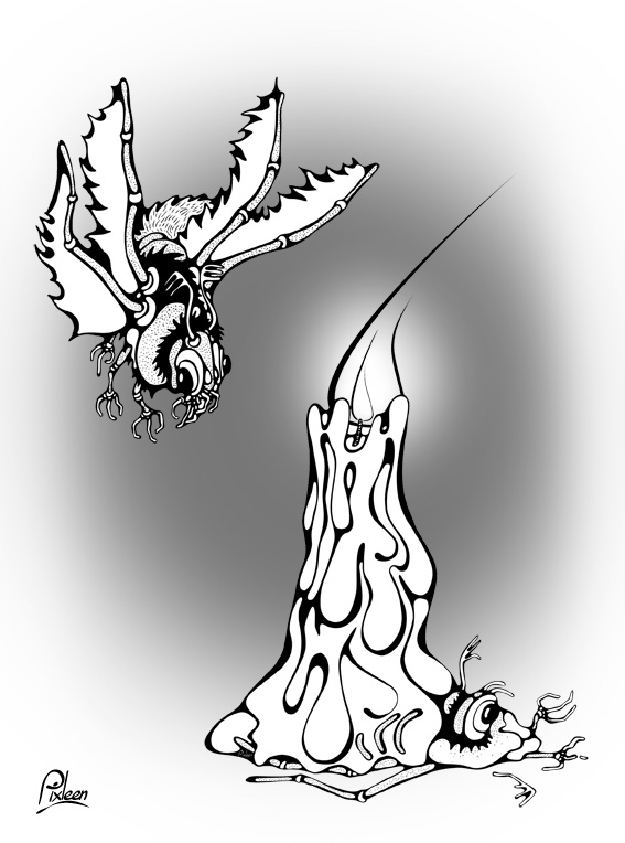La flamme d’une bougie dans la noir comme un soleil d’hiver, froid et plat, aux ombres longues, vacillantes, effilochées ; l’extrême fascination pour quelques insectes nocturnes…
